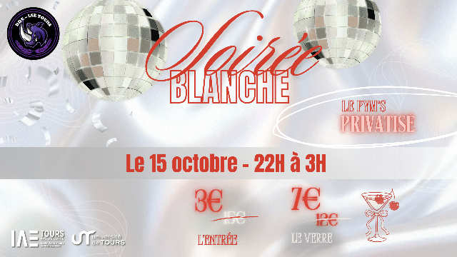 Réserve ton entrée à 3€ seulement pour la Soirée Blanche de l’IAE de Tours au Pym’s, le mercredi 15 octobre de 22h à 3h ! 🎉